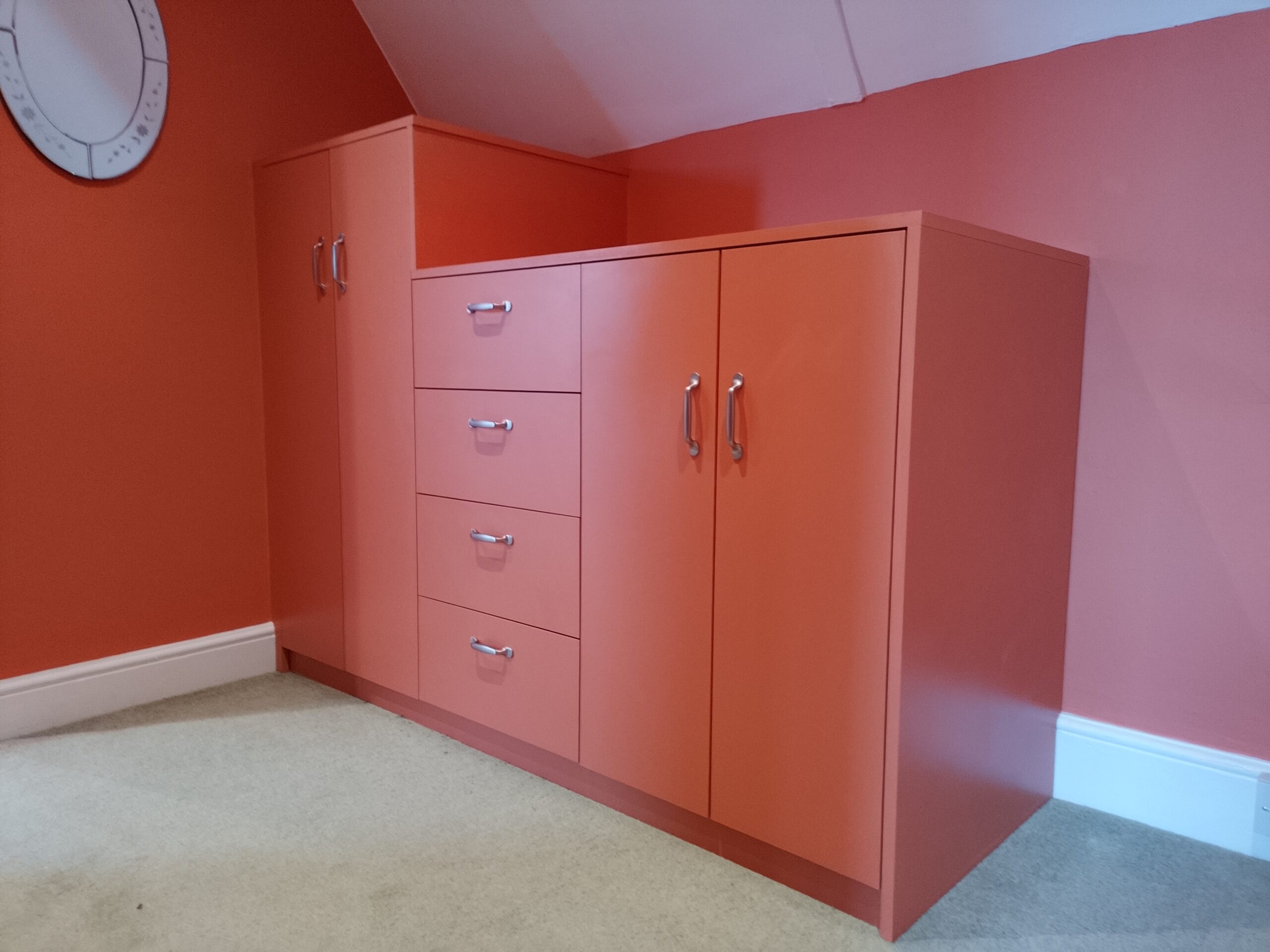 Heres another example of maximising the space you have. Giving desk space and cupboards for storage. You can see the initial design drawing which was modified to suit our customers comments. Then made and installed